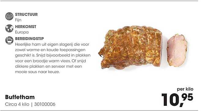 Buffetham biedt je de veelzijdigheid die je nodig hebt in de keuken. Het is eenvoudig te snijden in plakken, waardoor je snel kunt genieten van een smakelijke maaltijd. Serveer het bijvoorbeeld op een broodje met wat salade, of snijd dikkere plakjes voor op de borrelplank. De mogelijkheden zijn eindeloos!