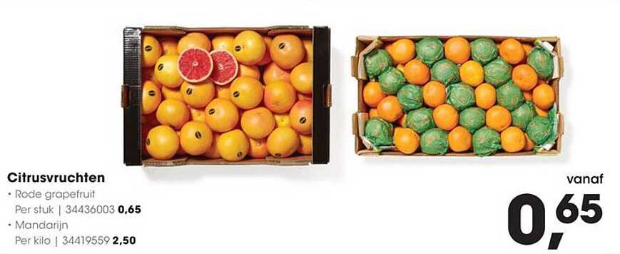 Met een per-stuk prijs van €0,65 voor de rode grapefruit en de mogelijkheid om mandarijnen te kopen voor €2,50 per kilo, zijn dit uitstekende aanbiedingen. Normaal gesproken zijn citrusvruchten vaak duurder, dus deze prijsverlaging is een kans die u niet wilt missen.