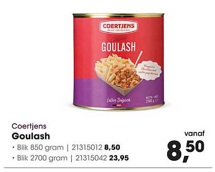De goulash is verkrijgbaar vanaf €8,50 voor het blik van 850 gram, wat ze een uitstekende keuze maakt als je kijkt naar de prijs/kwaliteitverhouding. Voor de grotere 2700 gram variant betaal je €23,95. Je bespaart dus aanzienlijk door in te slaan tijdens deze aanbieding!