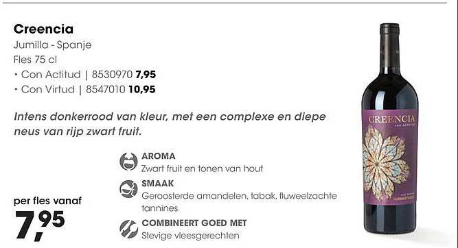 Maak kennis met Creencia, een prachtige wijn uit de Jumilla-regio in Spanje. Deze aanbieding is perfect voor wijnliefhebbers die op zoek zijn naar een kwaliteit wijn, zonder daarvoor de hoofdprijs te betalen. Met een uitstekende prijs-kwaliteitverhouding is dit een ideale kans om je wijnkelder aan te vullen met een verfijnd product. De aanbieding loopt van 6 oktober tot en met 18 oktober 2025, dus zorg ervoor dat je deze kans niet mist!