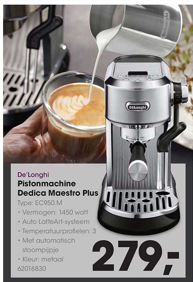Ben je op zoek naar een hoogwaardige koffiemachine die je de vrijheid geeft om als een echte barista thuis aan de slag te gaan? Kijk dan niet verder! Met de De'Longhi Pistonmachine Dedica Maestro Plus bereid je de meest heerlijke koffiespecialiteiten. Deze aanbieding geeft je de kans om dit prachtige apparaat te bemachtigen voor een scherpe prijs. Van het bereiden van een romige espresso tot het creëren van de perfecte cappuccino, deze machine heeft alles in huis.