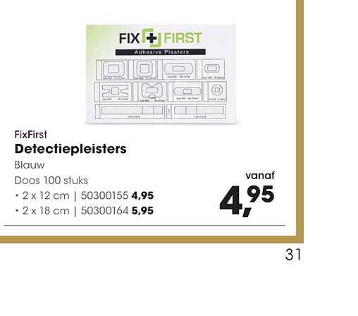 Heb je ooit een klein ongelukje gehad dat een pleister nodig had? Dan is deze aanbieding perfect voor jou! De Detectiepleisters van FixFirst zijn niet alleen handig, maar ook van hoge kwaliteit. Met deze pleisters ben je altijd voorbereid op kleine verwondingen, of het nu thuis, op school of tijdens je activiteiten is. Ze zijn er vanaf nu in de aanbieding, ideaal om je eerste hulp-kit aan te vullen.