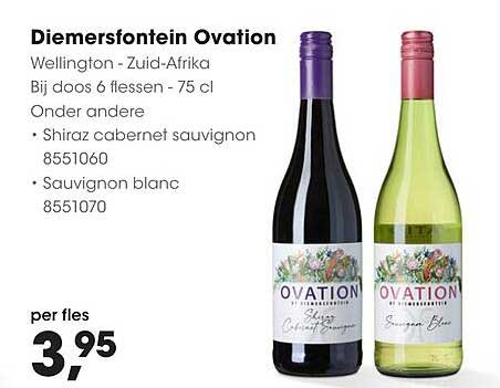 Ben je op zoek naar een geweldige wijn om je avonden mee op te fleuren? Zoek niet verder! Op deze pagina vind je een fantastische aanbieding voor de Diemersfontein Ovation. Deze wijnen, afkomstig uit Wellington, Zuid-Afrika, zijn perfect om te delen met vrienden of te genieten tijdens een romantisch diner. Met een aantrekkelijke prijs per fles van slechts €3,95, is dit de kans om je wijncollectie uit te breiden zonder je budget te overschrijden.