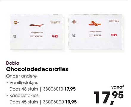 De chocoladedecoraties zijn verkrijgbaar in verschillende varianten, zoals vanillestokjes en kaneelstokjes. De doos met vanillestokjes bevat 48 stuks en kost €17,95, terwijl de doos met kaneelstokjes 45 stuks bevat en voor €19,95 verkrijgbaar is. Alle decoraties zijn gemaakt van de beste ingrediënten, waardoor je kunt vertrouwen op de kwaliteit van je baksels.