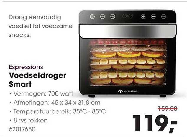 De Espressions Voedseldroger Smart is momenteel verkrijgbaar voor slechts €119,- in plaats van de gebruikelijke €150,-. Dit biedt aanzienlijke besparingen en is een slimme investering voor je gezondheid. Met deze aanbieding profiteer je van een hoogwaardige voedseldroger tegen een uitstekende prijs.