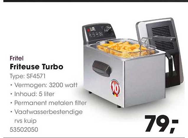 Ben jij een echte liefhebber van gefrituurd eten? Dan is deze aanbieding op de Fritel Friteuse Turbo misschien wel precies wat je nodig hebt! Met een krachtige verwarming van 3200 watt en een inhoud van 5 liter, ben je verzekerd van lekker krokante frietjes en snacks in een handomdraai. Deze friteuse is ideaal voor gezinnen, feestjes of gewoon wanneer je zin hebt in iets lekkers.