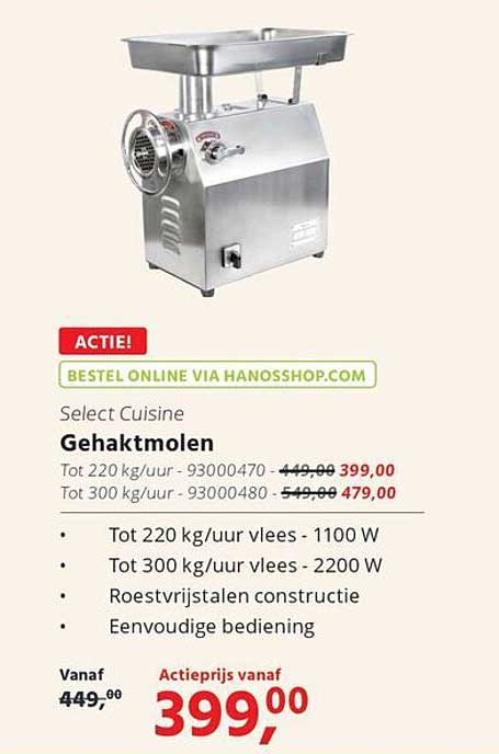 Ben je op zoek naar de perfecte gehaktmolen die zowel krachtig als betrouwbaar is? Dan is deze aanbieding van HANOS precies wat je nodig hebt! Met een actieprijs van slechts €399,00 (uiteraard van de oorspronkelijke prijs van €449,00) krijg je een kwalitatieve gehaktmolen van Select Cuisine die in geen enkele professionele keuken mag ontbreken.