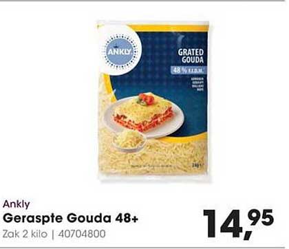 Wat een fantastische kans om je favoriete kaas aan te schaffen! De Geraspte Gouda 48+ van Ankly is perfect voor de liefhebbers van kaas en zal zeker niet teleurstellen. Met deze aanbieding van 2025-11-03 tot 2025-11-16 heb je volop tijd om te profiteren van deze geweldige deal en je gerechten te verrijken met deze heerlijke kaas.
