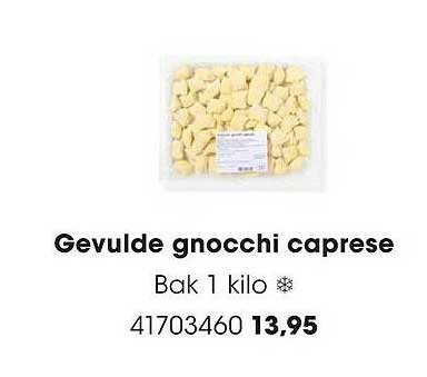 Maak kennis met de Gevulde Gnocchi Caprese, een heerlijke Italiaanse lekkernij die perfect is voor elke maaltijd. Deze gnocchi, speciaal gevuld met de kenmerkende smaken van caprese, is niet alleen een genot voor je smaakpapillen maar ook een geweldige toevoeging aan je dagelijkse menu. Met de aanbieding van slechts €13,95 voor een bak van 1 kilo, is dit de kans om iets bijzonders aan je tafel te brengen.