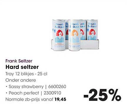 Ben je op zoek naar een verfrissend en uitdagend drankje voor de komende feestjes of een ontspannen avond thuis? Op deze pagina vind je een geweldige aanbieding van de Frank Seltzer, een heerlijke hard seltzer die perfect is voor elke gelegenheid. Met een aantrekkelijke korting van 25% is dit hét moment om deze verfrissing in huis te halen!
