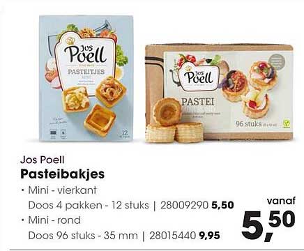 Ben je op zoek naar de perfecte aanvulling voor je snacks of feestelijke etentjes? Zoek niet verder! Op deze pagina vind je een fantastische aanbieding voor de heerlijke pasteibakjes van Jos Poell. Deze mini bakjes zijn perfect voor zowel zoete als hartige vullingen en maken elke gelegenheid bijzonder. Of je nu een feestje organiseert of gewoon wilt genieten van een lekkere snack, deze pasteibakjes zijn een must-have!