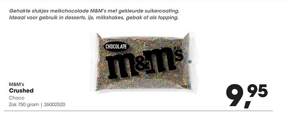 Voor slechts €9,95 haal je een zak M&M's Crushed in huis. Dit is een fantastische deal gezien de hoeveelheid en de kwaliteit van dit product. Normaal gesproken betaal je vaak meer voor snacks van deze kwaliteit. Mis deze kans niet om je voorraad op te bouwen!