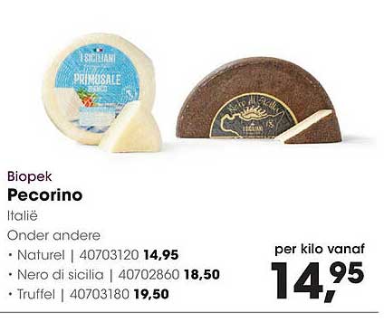 De Pecorino komt uit Italië en is gemaakt van schapenmelk. Het aanbod bestaat uit verschillende varianten, zoals de natuur smaak, Nero di Sicilia en Truffel. De natuur variant kost slechts €14,95 per kilo en heeft een romige textuur met een licht zoutige smaak. De andere varianten zijn ook verkrijgbaar, maar tegen een iets hogere prijs: €18,50 voor de Nero di Sicilia en €19,50 voor de truffelvariant. Al deze kazen zijn van hoge kwaliteit en ideaal voor culinaire toepassingen.