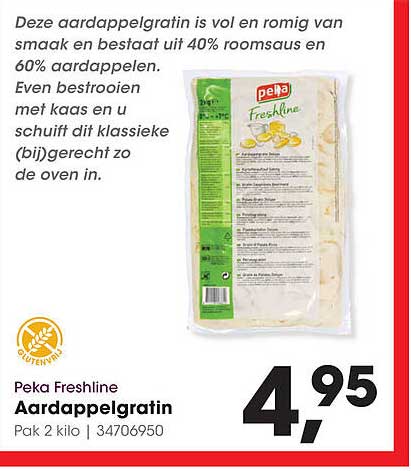 De Peka Freshline Aardappelgratin wordt geleverd in een verpakking van 2 kilo, ideaal voor gezinnen of bijvoorbeeld een etentje. Deze gratin is niet alleen smaakvol, maar ook van hoge kwaliteit. Het product bevat gluten, dus houd hier rekening mee als je allergieën hebt. De combinatie van-room saus en aardappelen zorgt voor een ultieme smeltervaring die je gasten zal verrassen.