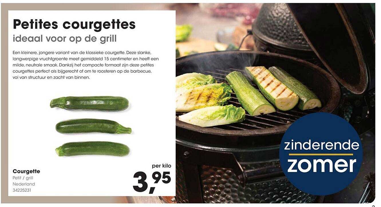 Deze aanbieding betreft de heerlijke petites courgettes, een perfecte keuze voor de zomermaanden. Met hun slanke, lange vorm zijn ze niet alleen aantrekkelijk om te zien, maar ook verrukkelijk van smaak. Of je ze nu op de grill of in een salade gebruikt, deze courgettes brengen je gerechten naar een hoger niveau. De aanbieding is geldig van 28 juli 2025 tot en met 10 augustus 2025, dus zorg ervoor dat je deze kans niet mist!