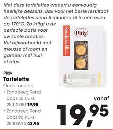 De Pidy Tartelettes zijn verkrijgbaar voor slechts €19,95. Dit is een uitstekende prijs voor 36 stuks, waardoor het een voordelige keuze is voor het creëren van luxe desserts zonder al te veel moeite. Vergelijk deze prijs met de normale kosten en je zult merken dat je een geweldige deal hebt!