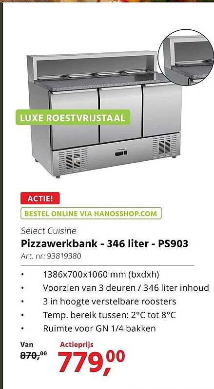 Ben jij een gepassioneerde kok of een pizzaliefhebber? Dan is de Pizzawerkbank - 346 liter - PS903 van Select Cuisine de perfecte aanvulling voor jouw keuken. Deze aanbieding biedt je de kans om een hoogwaardige werkbank aan te schaffen voor een scherpe prijs. Met een actieprijs van €779,00 in plaats van €870,00, is dit een kans die je niet wilt missen!