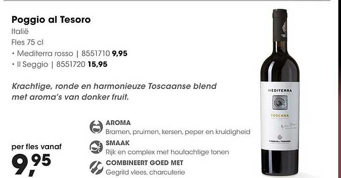 Met een scherpe vanafprijs van 9,95 is dit een aanbieding die je niet wilt missen. Vergelijk dit met de normale prijs van 15,95, en je ziet direct het voordeel. Het is een kans om een kwaliteitsproduct te ervaren zonder je budget te overschrijden. Dit is de perfecte gelegenheid om te genieten van een Toscaanse wijn tegen een ongelooflijke prijs!
