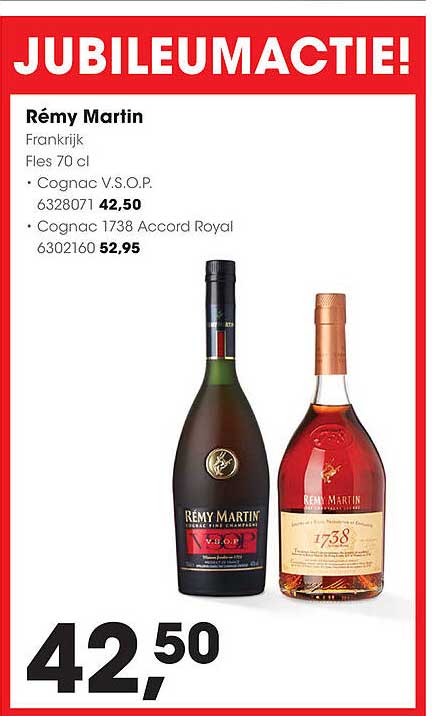De aanbieding omvat een fles van 70 cl van de bekende Rémy Martin Cognac V.S.O.P. met het nummer 6328071, die wordt aangeboden voor slechts €42,50. Daarnaast is er de Cognac 1738 Accord Royal (6320160) beschikbaar voor €52,95. Beide varianten zijn met zorg vervaardigd en bieden een unieke smaakervaring.