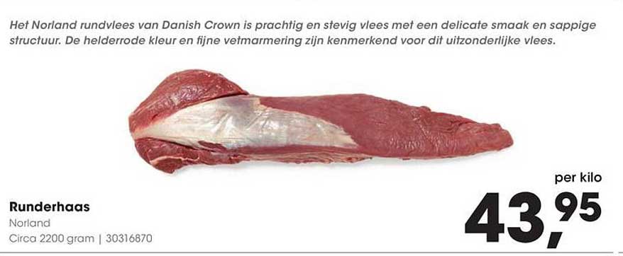 Maak kennis met de fantastische runderhaas van Norland, afkomstig van Danish Crown. Dit prachtige stuk vlees is niet alleen stevig, maar ook doordrenkt met een delicate smaak en een sappige structuur. Perfect voor bijzondere gelegenheden of gewoon om jezelf te verwennen. Als je op zoek bent naar een hoogwaardige vleessoort, dan is dit echt een aanbieding die je niet wilt missen!