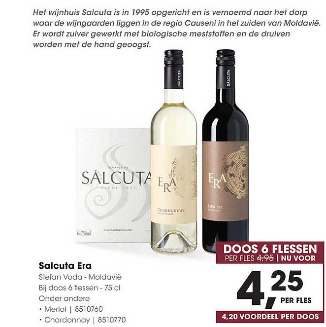 Ben je op zoek naar een heerlijke wijn voor een schappelijke prijs? Dan is deze aanbieding van Salcuta Era precies wat je nodig hebt! Dit wijnhuis, opgericht in 1995, staat bekend om zijn hoogwaardige wijnen uit de regio Causeni in Moldavië. Met een dozijn interessante smaken en mogelijkheden is dit een perfect aanbod voor iedereen die van kwaliteit houdt.