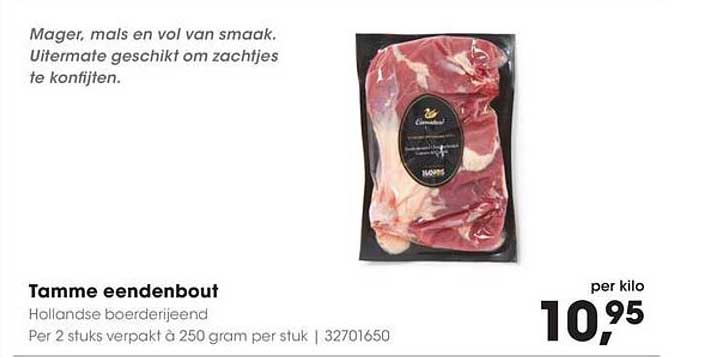 Je kunt deze heerlijke Tamme eendenbout nu aanschaffen voor een prijs van €10,95 per kilo. Dit is een geweldige kans gezien de normale prijs voor eendenvlees vaak hoger ligt. Met deze aanbieding bespaar je niet alleen geld, maar investeer je ook in een culinaire ervaring die je niet wilt missen. Geniet van de luxe van eendenbout zonder de hoge kosten!