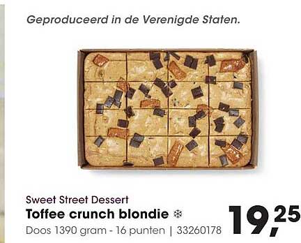 Met een aanbieding van €19,25 is de Toffee crunch blondie een uitstekende keuze. Vergelijk dit met de normale prijs, en je zult zien dat je hier een geweldige deal grijpt! De perfecte gelegenheid om je zoetekauw te verwennen zonder diep in je portemonnee te hoeven tasten.