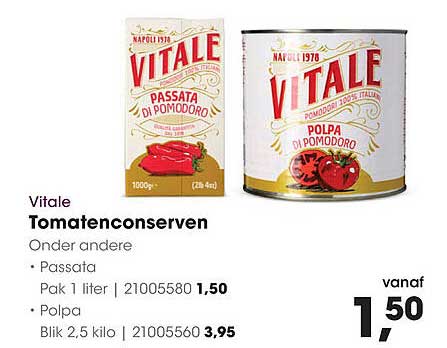 Ben jij een fan van Italiaanse gerechten? Dan is deze aanbieding echt iets voor jou! De Vitale Tomatenconserven zijn ideaal voor het bereiden van sauzen, soepen en verschillende andere heerlijke gerechten. Met deze aanbieding kun je de smaak van Italië direct naar jouw keuken brengen. De aanbieding is geldig van 2025-10-06 tot en met 2025-10-18, dus mis deze kans niet!