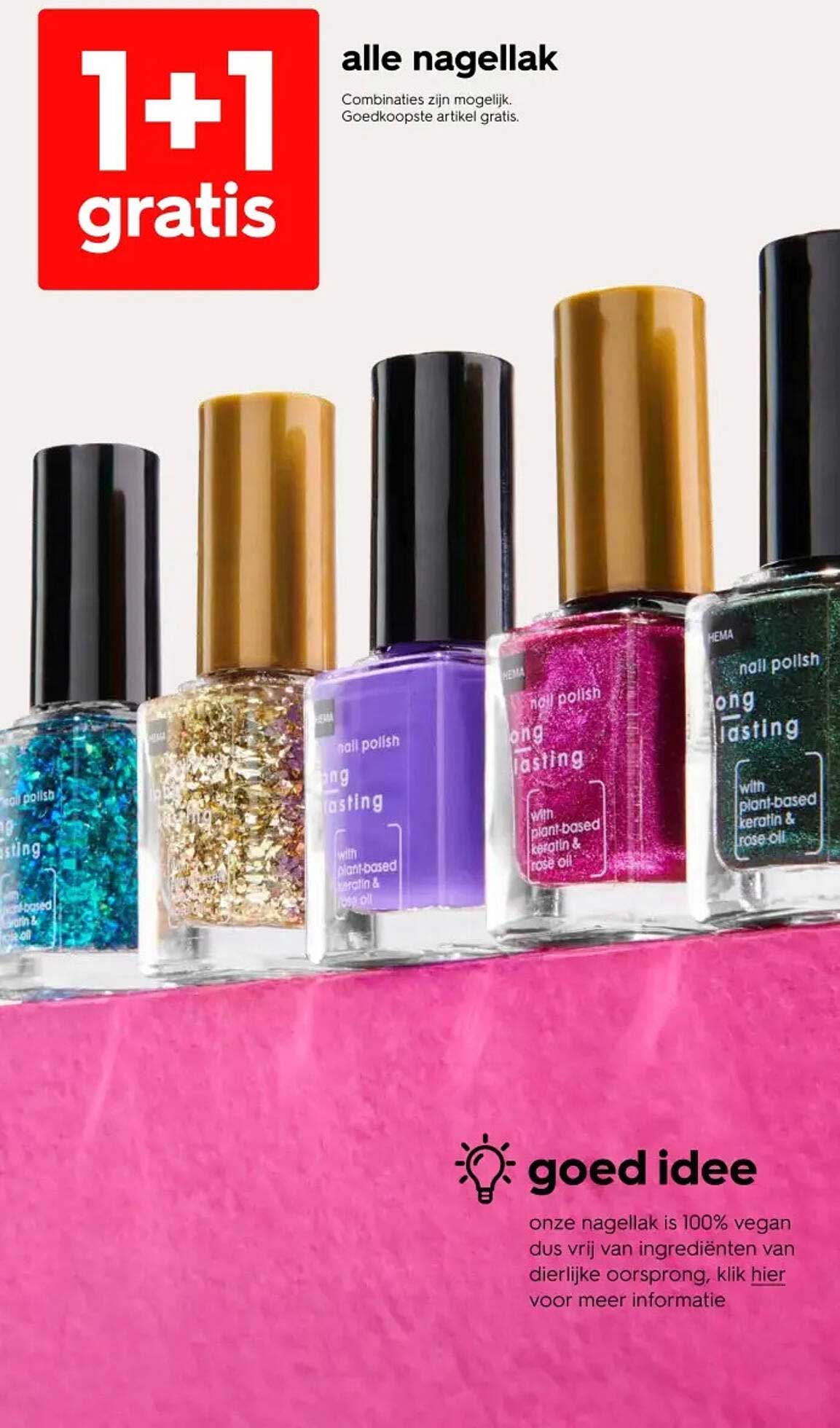 Bekijk de 1+1 Gratis Alle Nagellak aanbieding bij HEMA! Deze fantastische aanbieding is nu beschikbaar in de nieuwste HEMA folder. Profiteer van deze kans en bespaar flink op je aankoop.