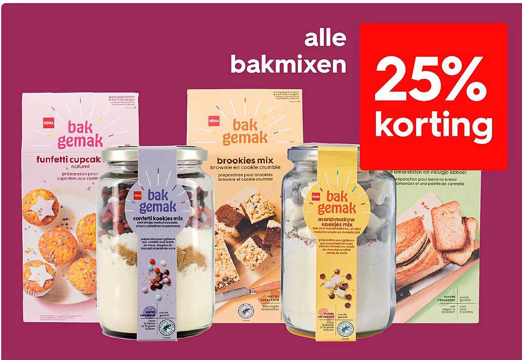 Ben jij ook zo'n liefhebber van bakken? Dan hebben we fantastisch nieuws voor je! Op deze pagina vind je een geweldige aanbieding van HEMA: maar liefst 25% korting op alle bakmixen. Of je nu cupcakes, koekjes of een heerlijke brownie wilt bakken, met deze mixen wordt de bereiding een fluitje van een cent. Dit is het moment om je bakskills naar een hoger niveau te tillen!