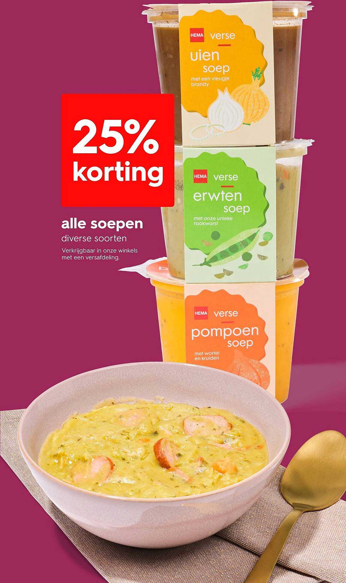 Bekijk nu de 25% korting op alle soepen aanbieding in de HEMA folder. Deze aanbieding is geldig van 13-10-2025 tot en met 19-10-2025.