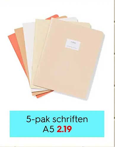 Bekijk nu de 5-pak schriften A5 aanbieding in de HEMA folder. Deze aanbieding is geldig van 11-08-2025 tot en met 24-08-2025.