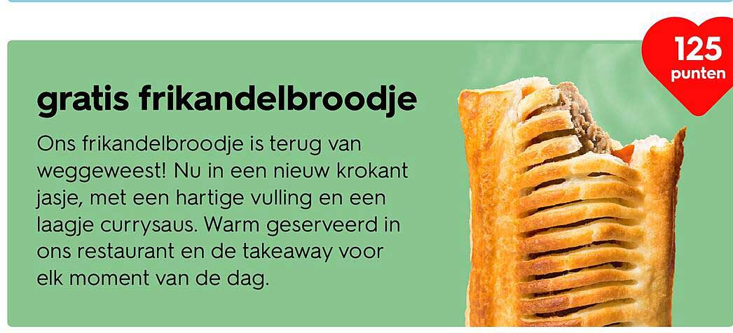 Normaal gesproken zou je voor een frikandelbroodje betalen, maar nu bieden wij het jou helemaal gratis aan als je 125 punten hebt verzameld. Dit is een fantastische kans om een lekkernij te proberen die je anders misschien niet zou kopen. Mis deze aanbieding niet, het is de ideale gelegenheid om onze heerlijke snaks te ontdekken!