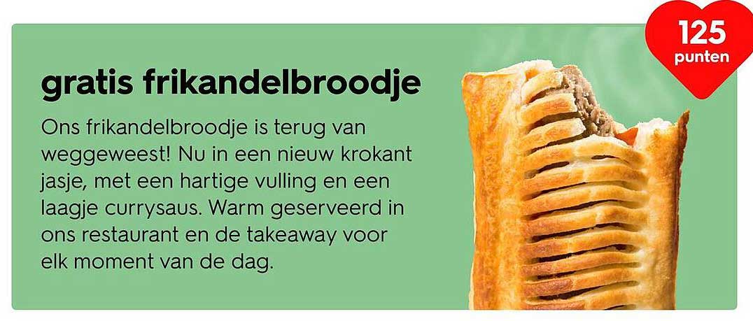 Normaal gesproken betaal je voor zo'n lekkere snack meer, maar met deze aanbieding krijg je het frikandelbroodje gratis bij besteding van 125 punten. Dit is een geweldige kans om iets lekkers te proberen zonder extra kosten. Vergelijk dit met de prijs die je normaal zou betalen en je snapt direct waarom dit een aanbod is dat je niet wilt missen!