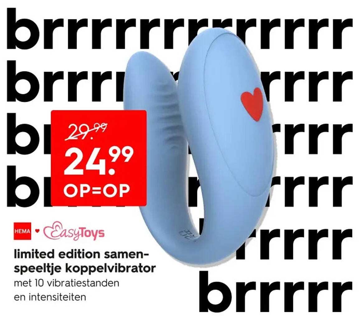 Bekijk de Limited Edition Samen-Speeltje Koppelvibrator aanbieding bij HEMA! Deze fantastische aanbieding is nu beschikbaar in de nieuwste HEMA folder. Profiteer van deze kans en bespaar flink op je aankoop.