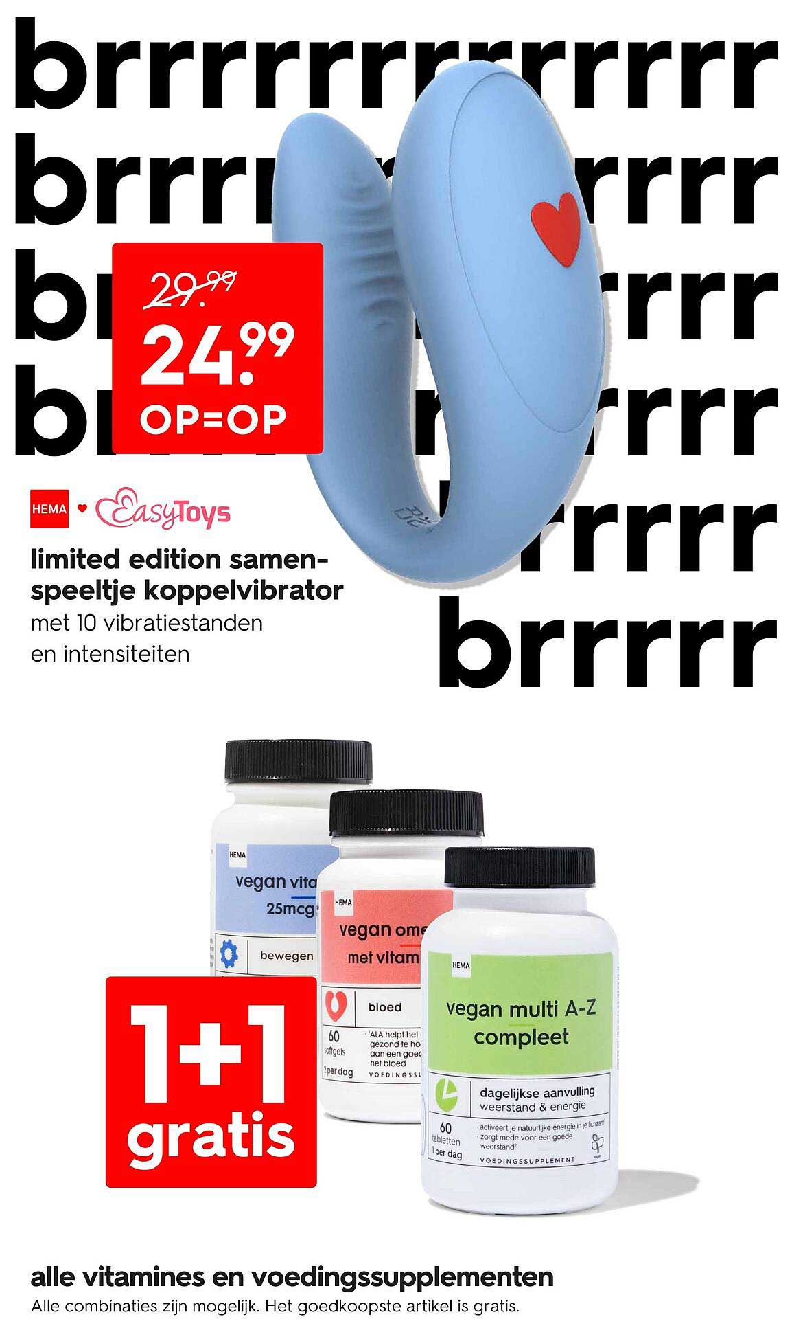 Bekijk nu de limited edition samen-speeltje koppelvibrator aanbieding in de HEMA folder. Deze aanbieding is geldig van 28-10-2024 tot en met 03-11-2024.