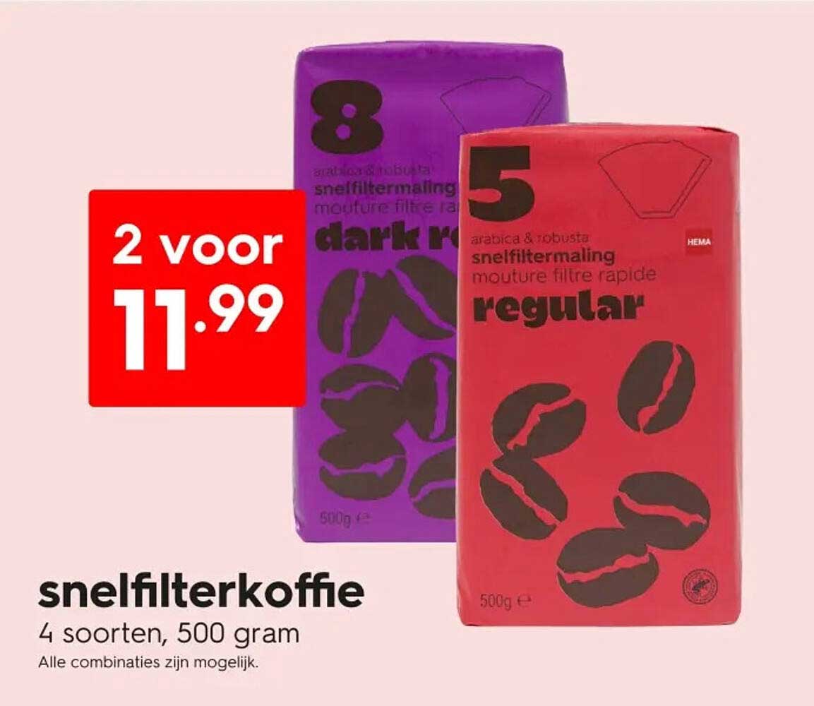 Ontdek de onweerstaanbare aanbieding van HEMA voor snelfilterkoffie! Van 27 oktober tot en met 2 november kun je deze heerlijke koffie in 4 verschillende soorten meenemen. Perfect voor de koffieliefhebber die van gemak houdt. Met de mogelijkheid om te combineren, kun je jouw favoriete smaken ontdekken of gewoon een voorraad aanleggen voor die cosy momenten thuis.
