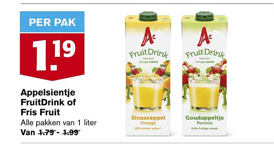 Bekijk de Appelsientje Fruitdrink Of Fris Fruit aanbieding bij Hoogvliet! Deze fantastische aanbieding is nu beschikbaar in de nieuwste Hoogvliet folder. Profiteer van deze kans en bespaar flink op je aankoop.