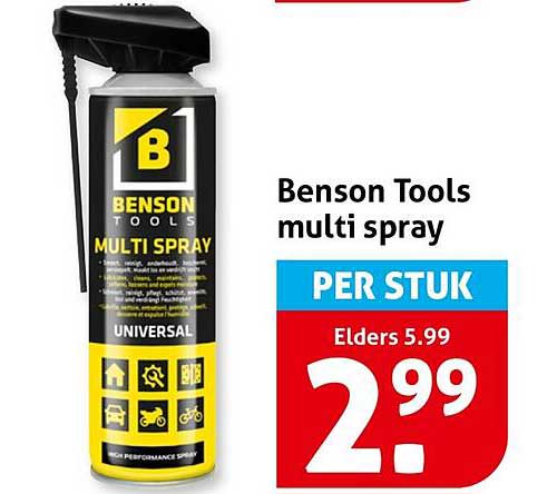 Ben je op zoek naar een veelzijdige oplossing voor al jouw onderhoudswerkzaamheden? Dan is de Benson Tools multi spray iets voor jou! Deze krachtige spray is perfect voor tal van toepassingen in en om het huis, en deze aanbieding maakt het nog aantrekkelijker. Met een scherpe prijs van slechts €2,99 in plaats van €5,99 kun je nu flink besparen. Perfect voor de doe-het-zelver die kwaliteit en veelzijdigheid waardeert!