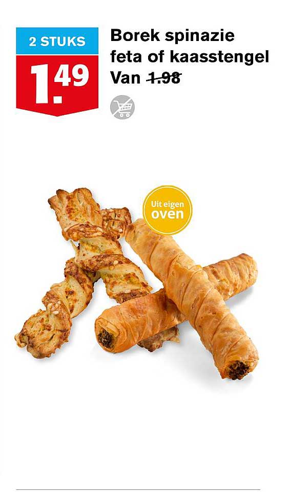 Bekijk nu de Borek spinazie feta of kaassstengel Van 1.98 aanbieding in de Hoogvliet folder. Deze aanbieding is geldig van 26-03-2025 tot en met 01-04-2025.