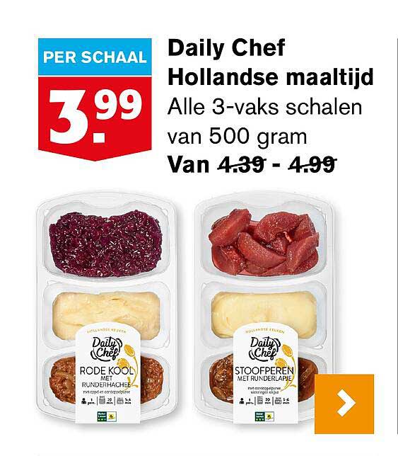 Bekijk nu de Daily Chef Hollandse maaltijd aanbieding in de Hoogvliet folder. Deze aanbieding is geldig van 16-04-2025 tot en met 22-04-2025.