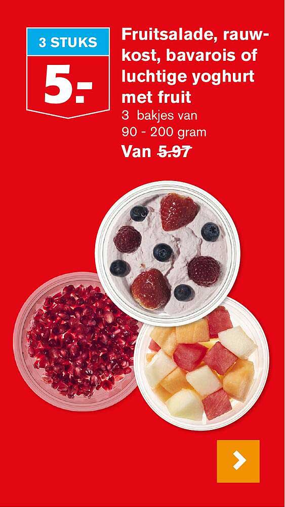 Bekijk de Fruitsalade, Rauw-Kost, Bavarois Of Luchtige Yoghurt Met Fruit aanbieding bij Hoogvliet! Deze fantastische aanbieding is nu beschikbaar in de nieuwste Hoogvliet folder. Profiteer van deze kans en bespaar flink op je aankoop.