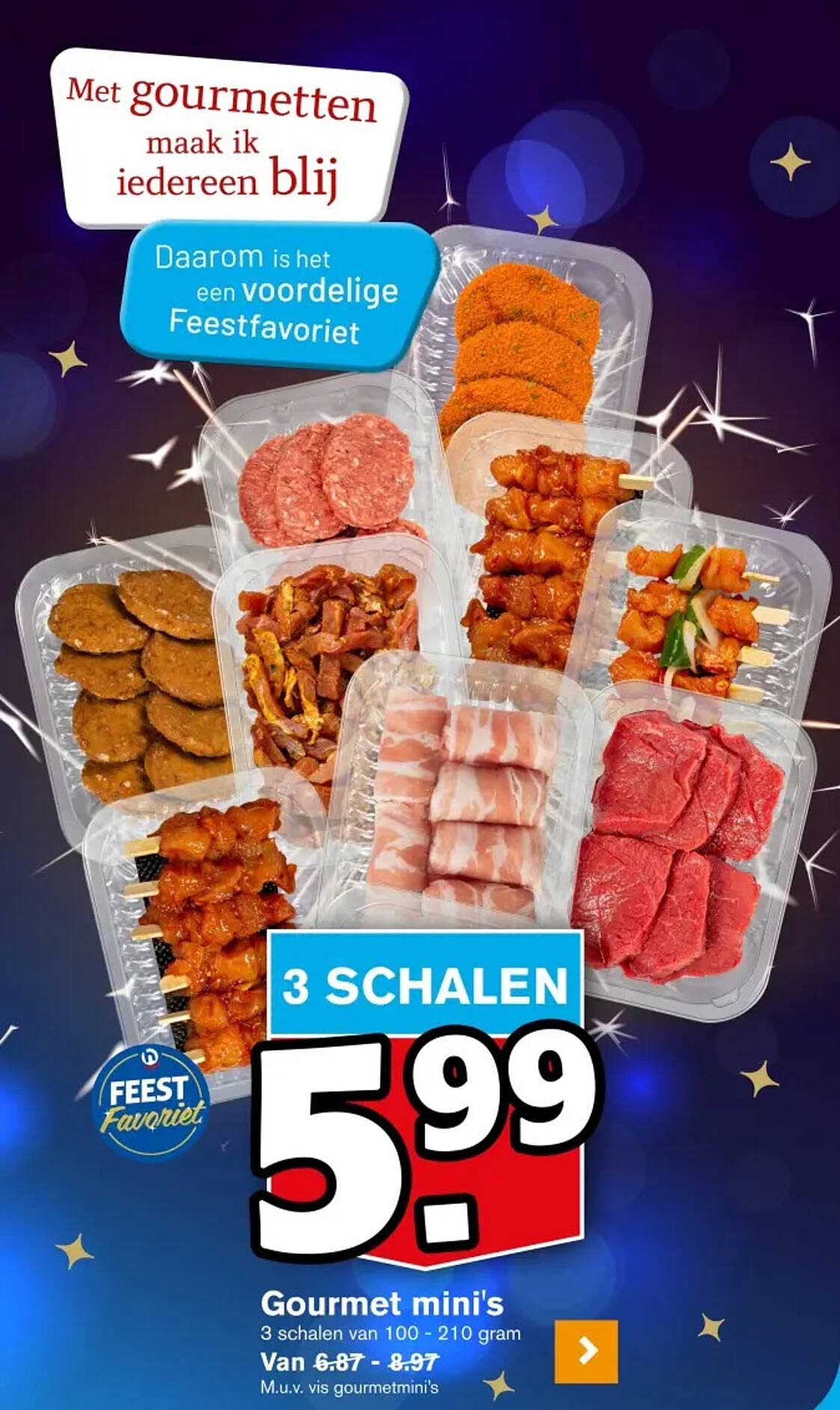 Ontdek de geweldige Gourmet Mini's aanbieding in de nieuwste Hoogvliet folder. Naast deze aanbieding vind je nog veel meer aantrekkelijke kortingen. Je kunt de Gourmet Mini's eenvoudig online bestellen via de Hoogvliet website of kopen in een winkel bij jou in de buurt.