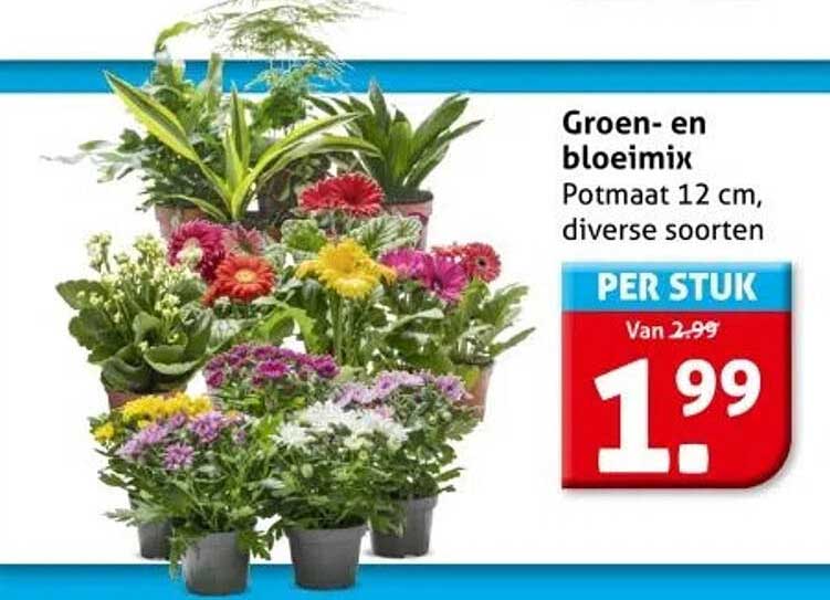 De groen- en bloeimix is tijdelijk verkrijgbaar voor slechts €1,99 per stuk, waar de normale prijs €2,99 is. Dit betekent dat je maar liefst €1,00 bespaart! Dit is een uitstekende kans om je huis of tuin op te fleuren zonder je budget te overschrijden.