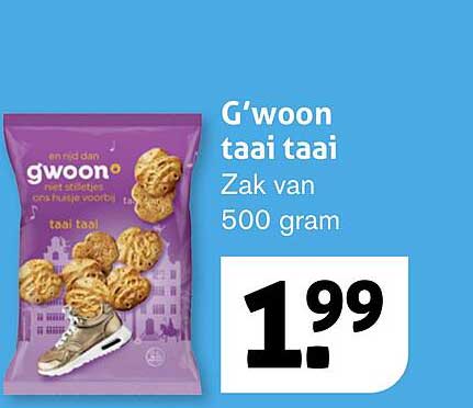 Bekijk de G'woon Taai Taai aanbieding bij Hoogvliet! Deze fantastische aanbieding is nu beschikbaar in de nieuwste Hoogvliet folder. Profiteer van deze kans en bespaar flink op je aankoop.