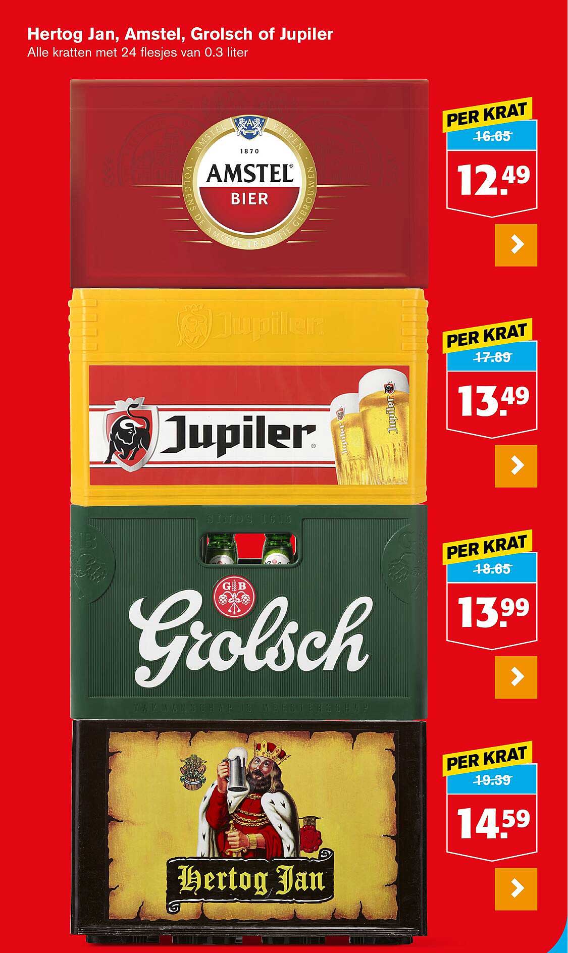 Wil je direct op de hoogte zijn zodra de Hertog Jan, Amstel, Grolsch Of Jupiler in de aanbieding is? Meld je aan voor onze aanbiedingen-alert. Zo krijg je een melding zodra het product tegen een voordelige prijs beschikbaar is.