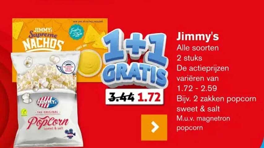 Bekijk de Jimmy's Alle Soorten aanbieding bij Hoogvliet! Deze fantastische aanbieding is nu beschikbaar in de nieuwste Hoogvliet folder. Profiteer van deze kans en bespaar flink op je aankoop.
