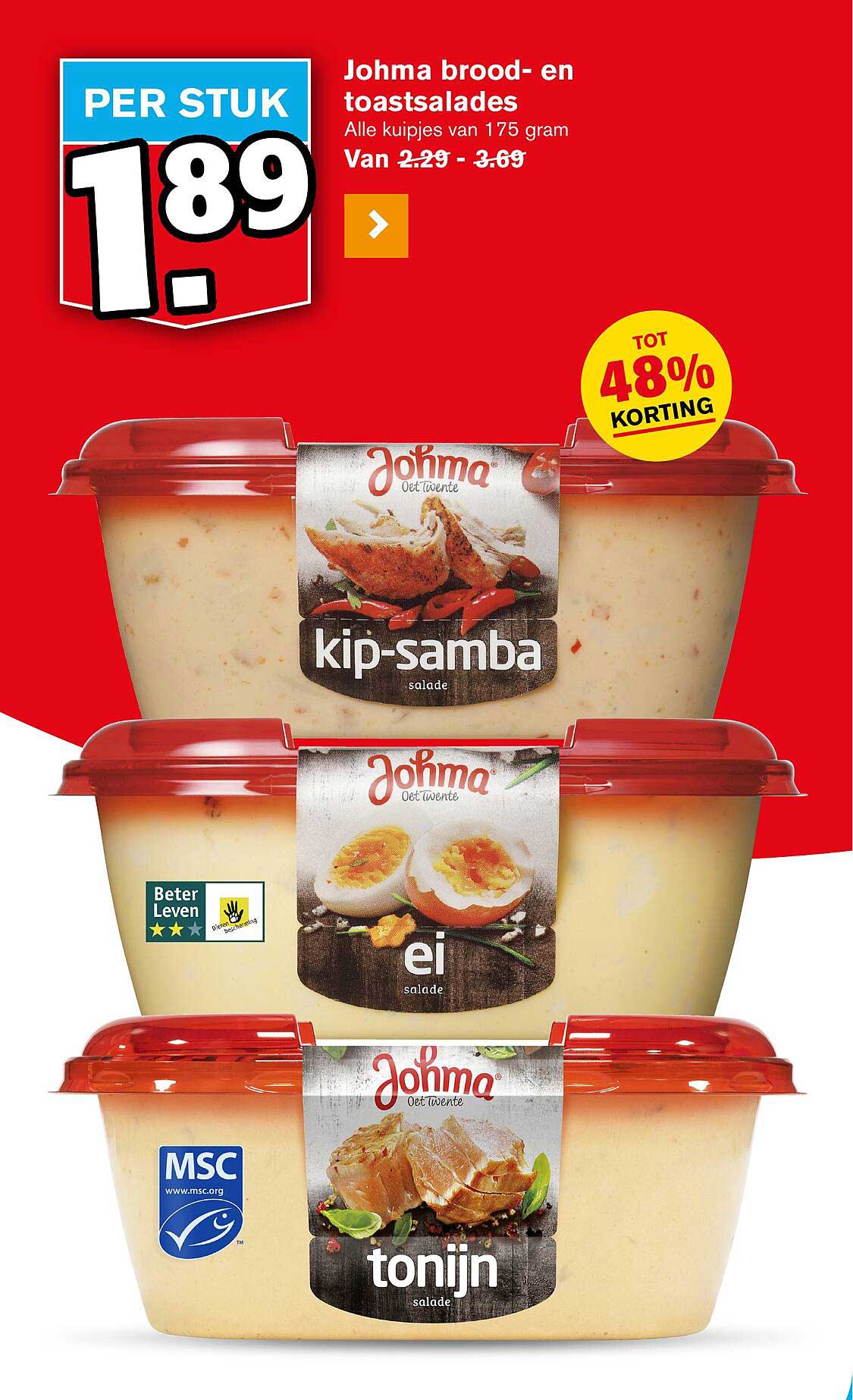 Bekijk de Johma Brood- En Toastsalades aanbieding bij Hoogvliet! Deze fantastische aanbieding is nu beschikbaar in de nieuwste Hoogvliet folder. Profiteer van deze kans en bespaar flink op je aankoop.