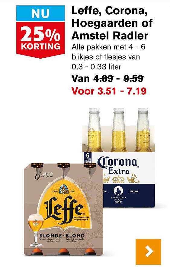 Bekijk de Leffe, Corona, Hoegaarden Of Amstel Radler aanbieding bij Hoogvliet! Deze fantastische aanbieding is nu beschikbaar in de nieuwste Hoogvliet folder. Profiteer van deze kans en bespaar flink op je aankoop.