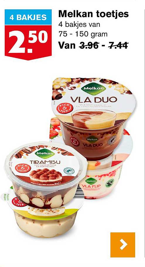 Heerlijke Melkan toetjes zijn er nu in een speciale aanbieding bij Hoogvliet! Deze romige toetjes zijn perfect voor elk moment van de dag, of je ze nu als dessert na het avondeten gebruikt of als tussendoortje. Met de aanbieding van 4 bakjes voor slechts €2,50, kun je jezelf en je gezin verwennen zonder je portemonnee te veel te belasten. Het is een kans die je niet wilt missen!